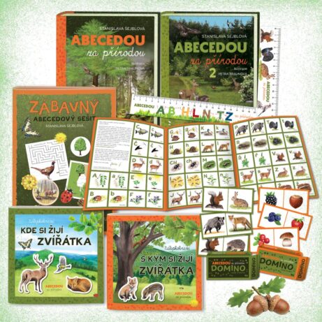 2× tištěná kniha + 2× záložka + pexeso + 2x samolepkový sešit + zábavný abecedový sešit + 2× domino